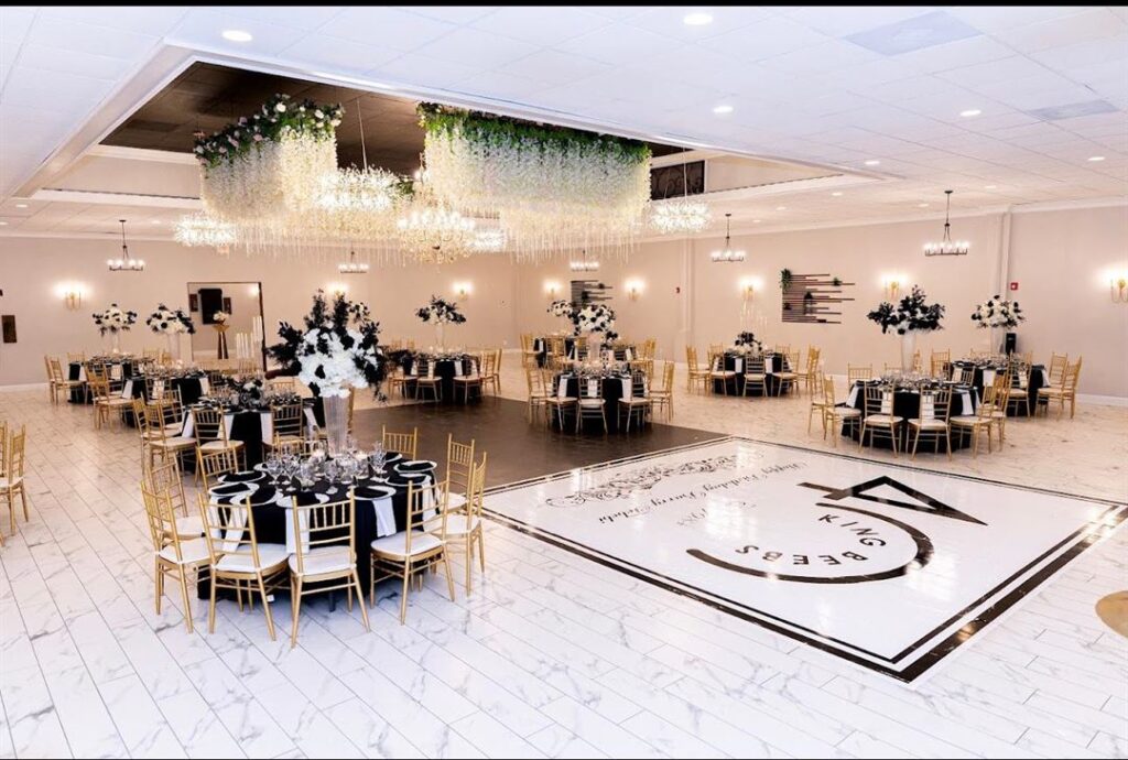 The recently renovated Calista Ballroom offers farmhouse style and five-star service. The spacious ballroom can fit up to 300 guests and includes a beautiful flower chandelier roof in the center of the dance floor. Other amenities include a bridal room, restrooms, and buffet hall. Reviewers rave about the venue’s event team and their care and commitment to customers.